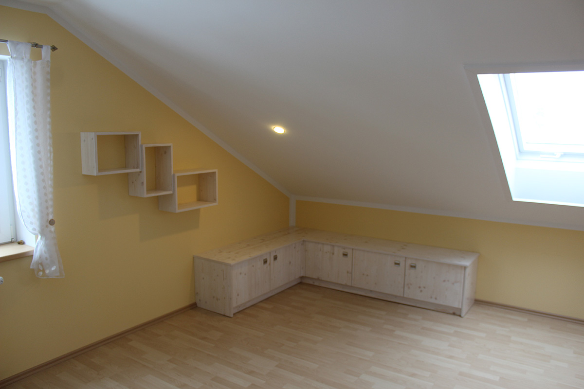 Um das Büro effektiv ausnutzen zu können, wurden alle Elemente passgenau unter der Dachschräge gefertigt und montiert. Die meisten Oberflächen durften ihren natürlichen Charme behalten. Ein Regal über der Schreibtischplatte ergänzt die Komposition. Ausgestattet mit Auszügen, Fächern und Ablagen, bietet es ausreichend Platz für alle benötigten Dinge.