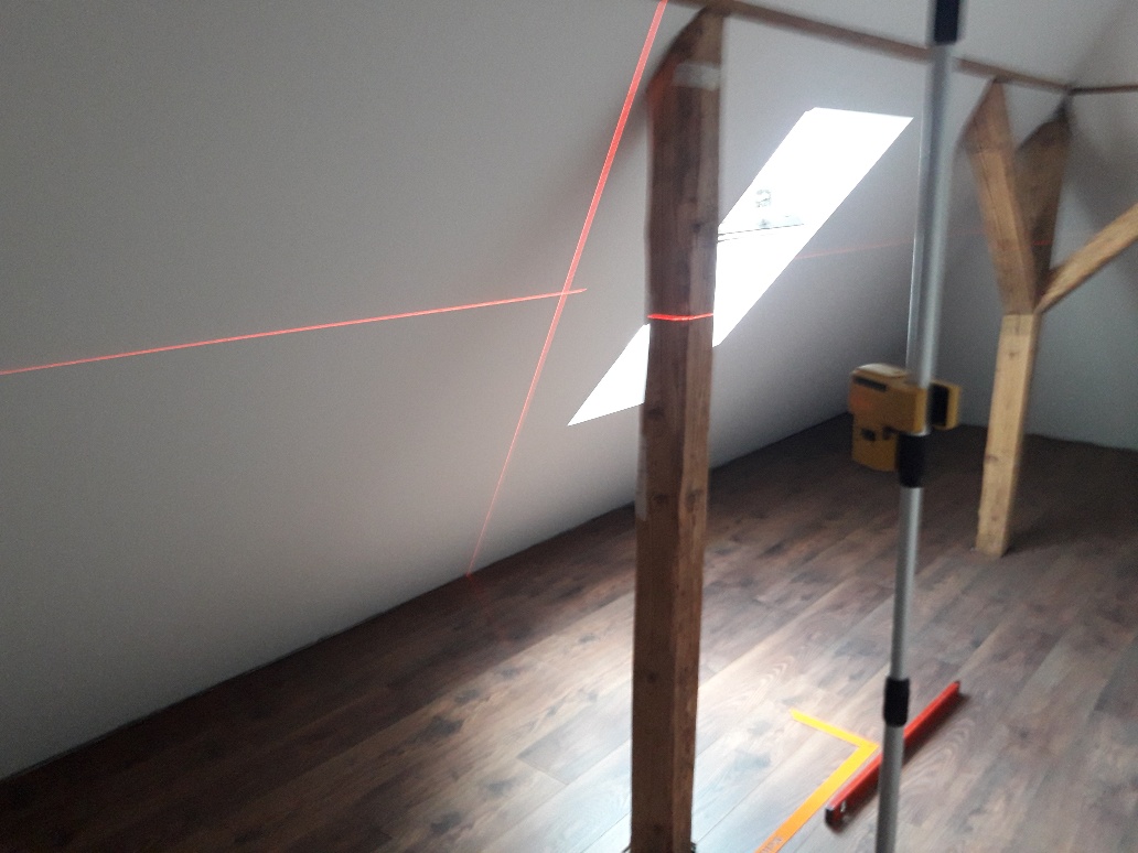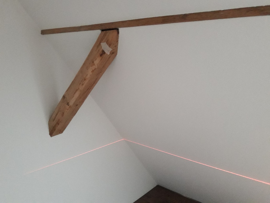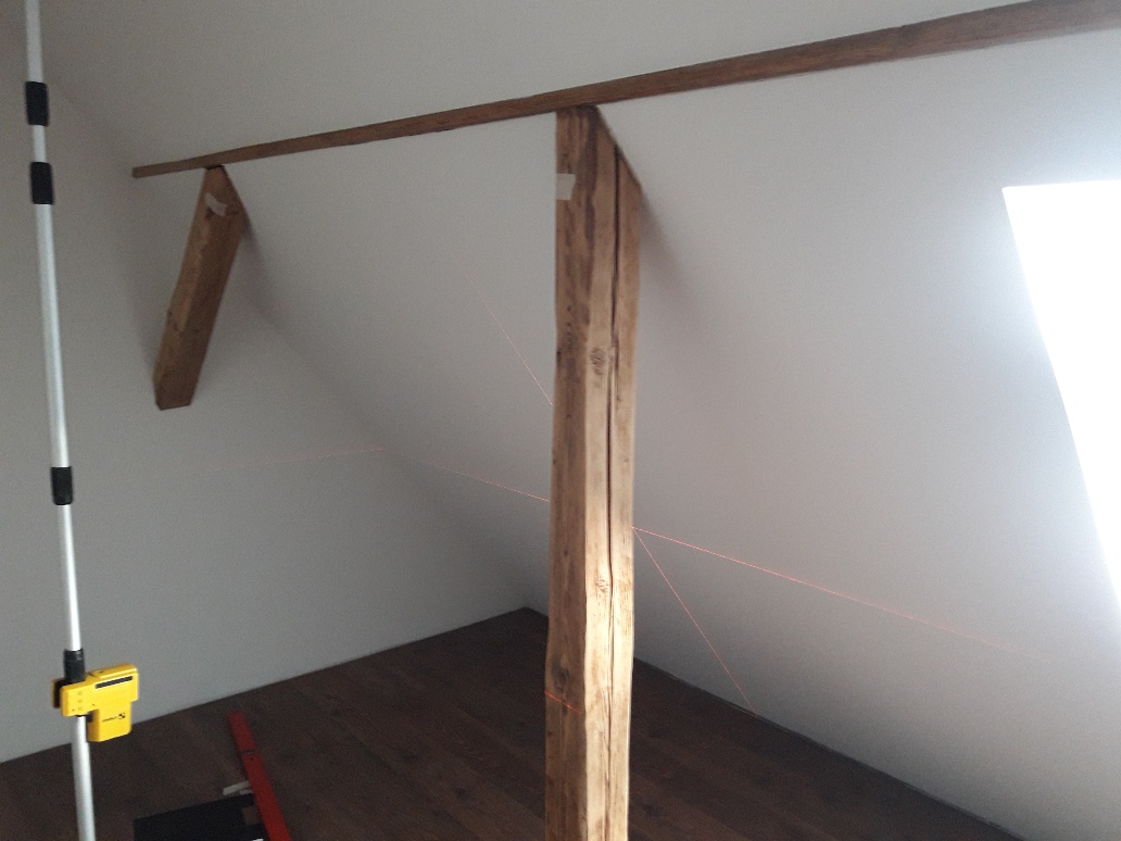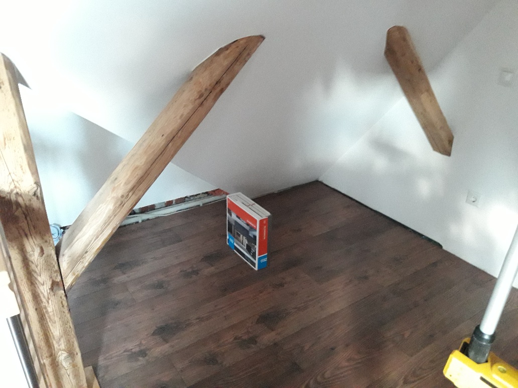 Diesen Schrank erkennt man nicht gleich auf den ersten Blick. Mit Altholz wurde ein Teil des Dachgebälks simuliert, in welchen der Schrank untergabracht ist. Somit erhielt die glatte Dachschräge ein paar ansprechende Ecken und Kanten. Neben den Türen, welche die Fächer verstecken, kommt ein Teil des Schrankes in voller Höhe als Auszug zur Verwendung. Der Kontrast zwischen dem Weiß- und Altholz spielgelt sich im gesamten Raum wider.