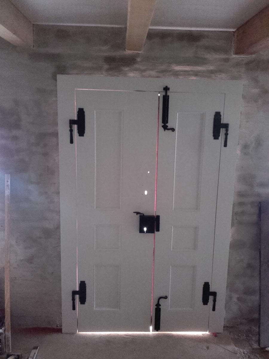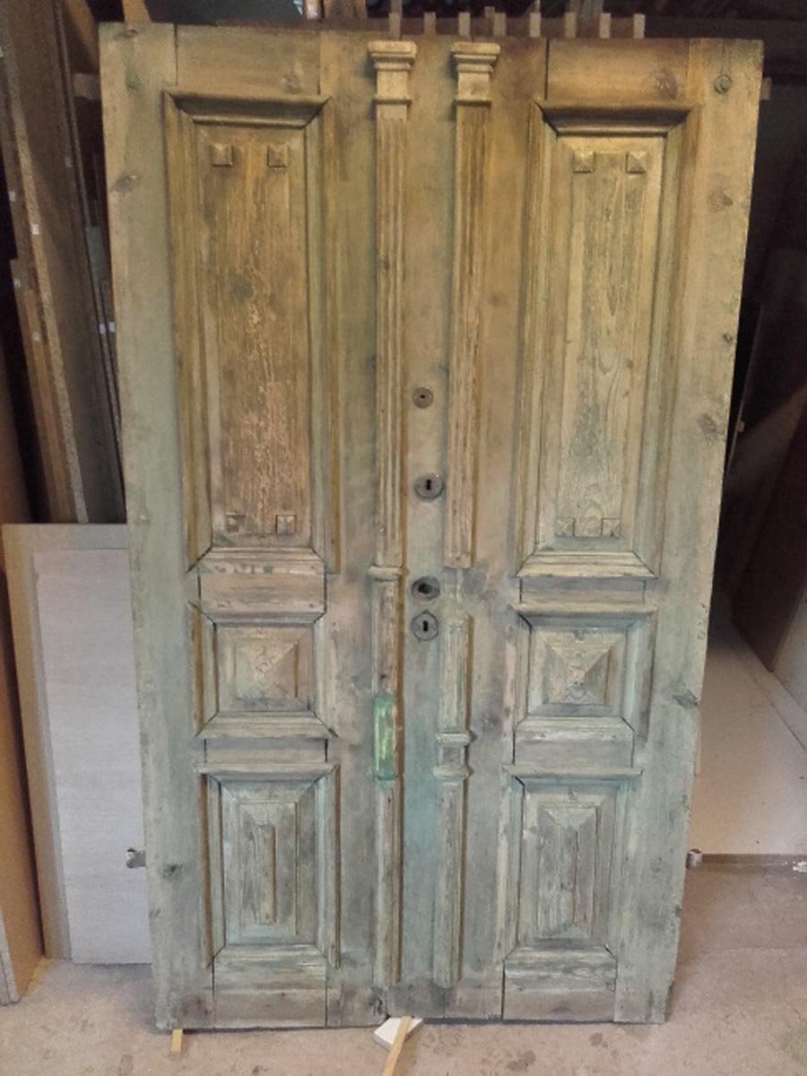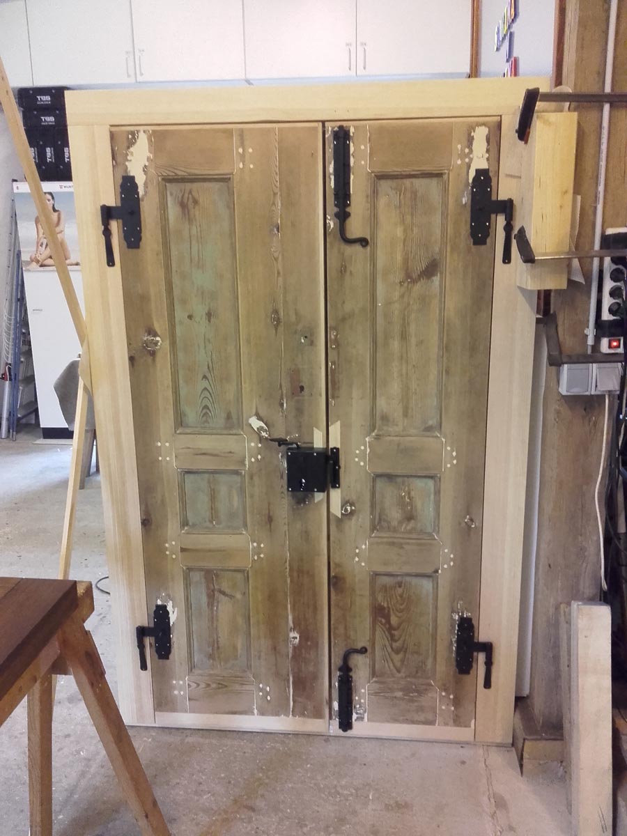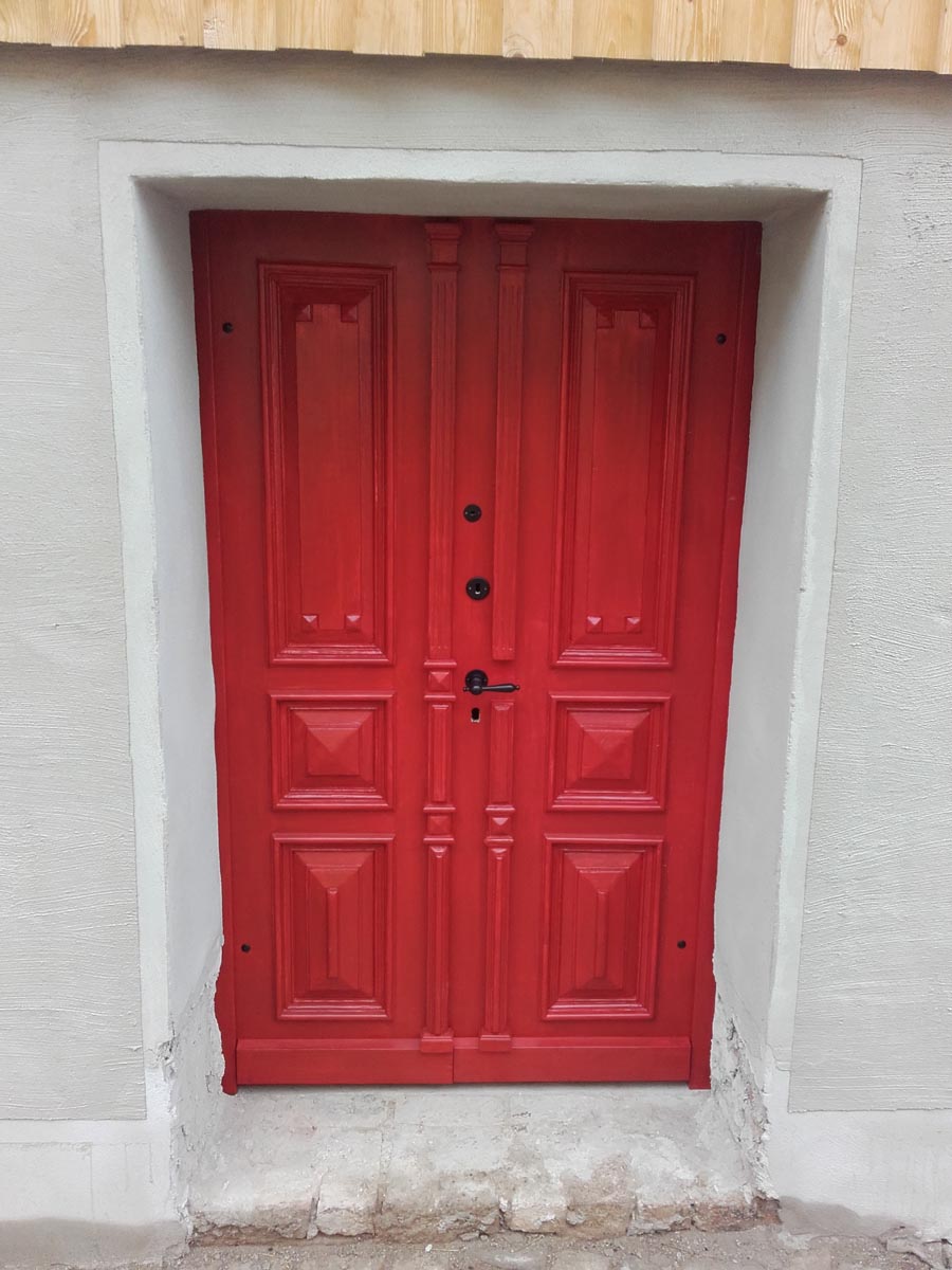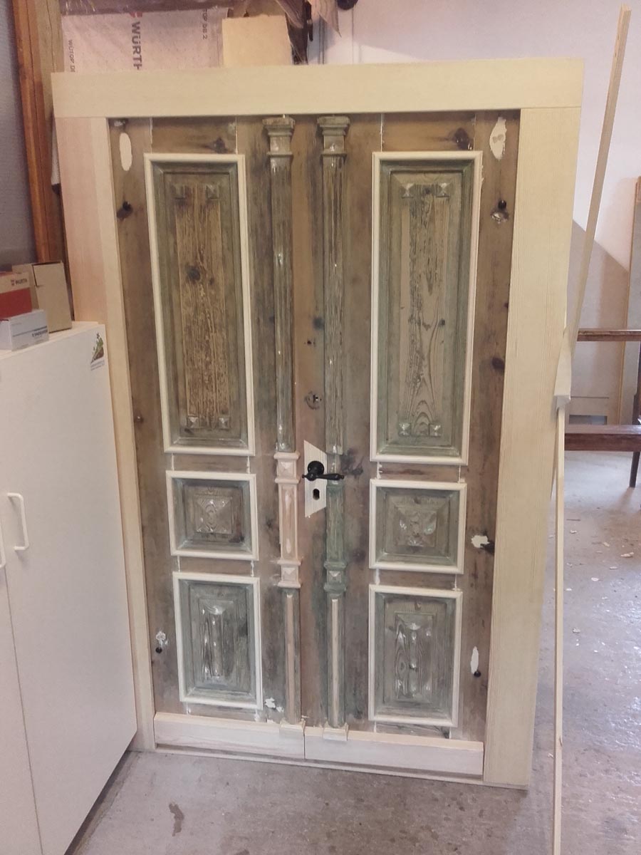 Diese alte Tür wurde vom Sperrmüll gerettet , bekommt eine zweite Chance. Was ürsprünglich vernichtet werden sollte, wurde somit zum Blickfang am Haus. Die Oberfläche wurde komplett überarbeitet und gestrichen. Der fehlende Türstock wurde angefertigt und die Profile ersetzt und vervollständigt. Beschläge wie Bänder, Schlosskasten und Drücker-Garnitur, sowie Riegel werden arttypisch beschafft und eingearbeitet.
