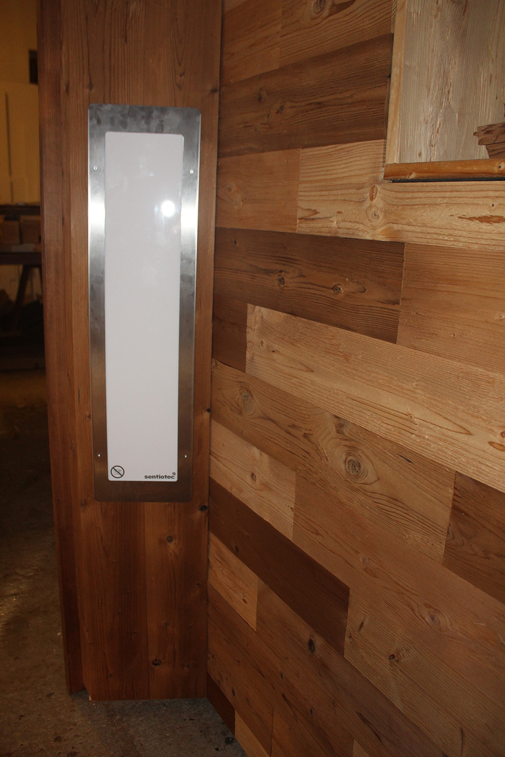 Diese individuell gestaltete Infrarotkabine ermöglicht wärmende Entspannung für den Besitzer und seine Gäste. Ob Muster der Täfelung oder die ergonomische Form des Stuhles - alles passt zueinander.
