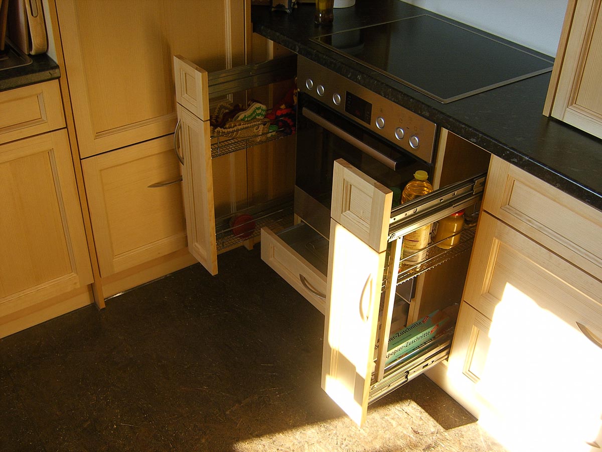 Vorn mit Falttüren, unten geschlossen damit die Küchengeräte versteckt sind, wenn man diese schließ. Die „Rückwand“ wurde als Schiebetür ausgearbeitet, welche sich hinter den angrenzenden Hochschrank verschiebt. Dadurch erhält man den Zugang zum Flur und der Einkauf kann direkt in die Küche geschoben/gestellt werden.