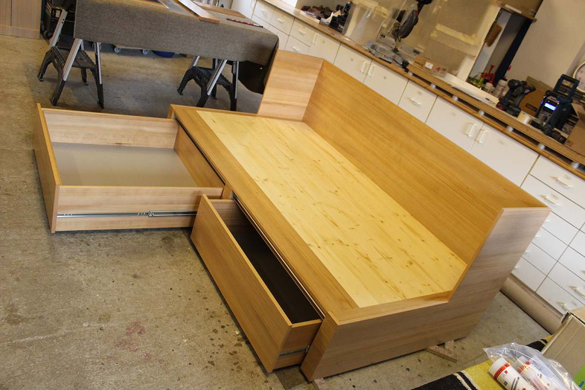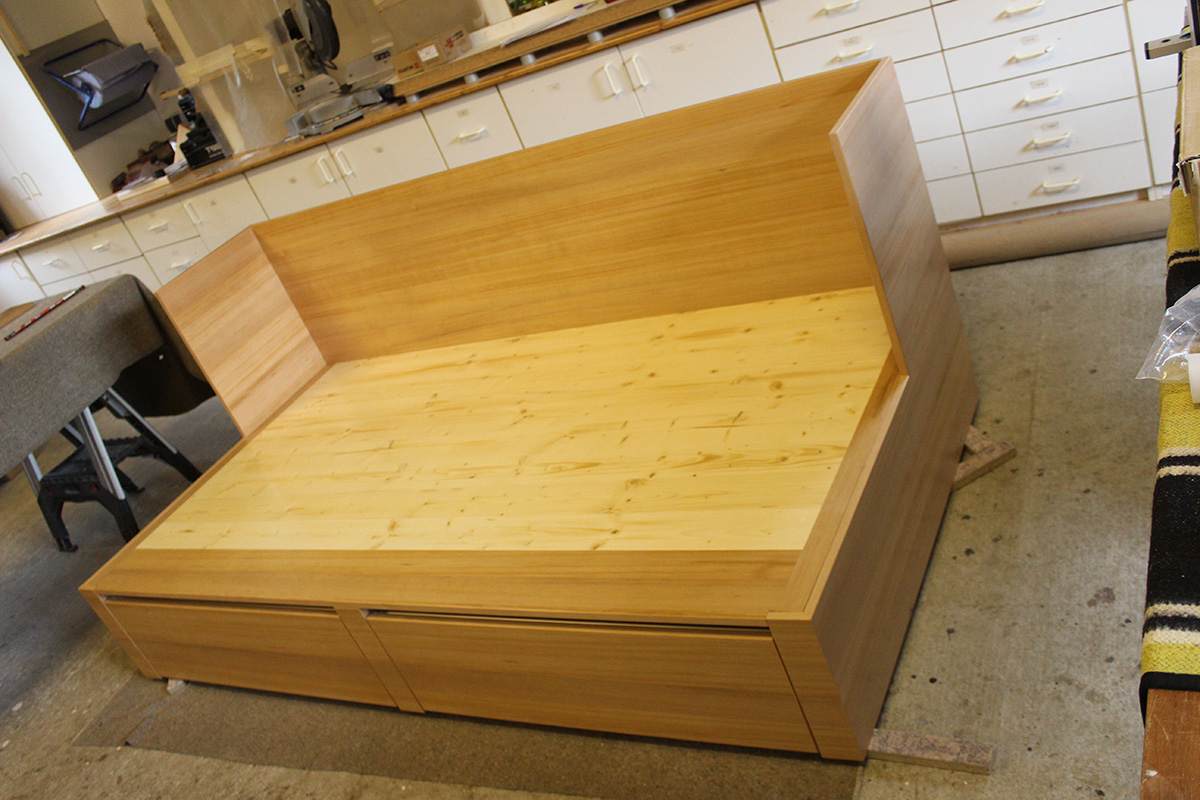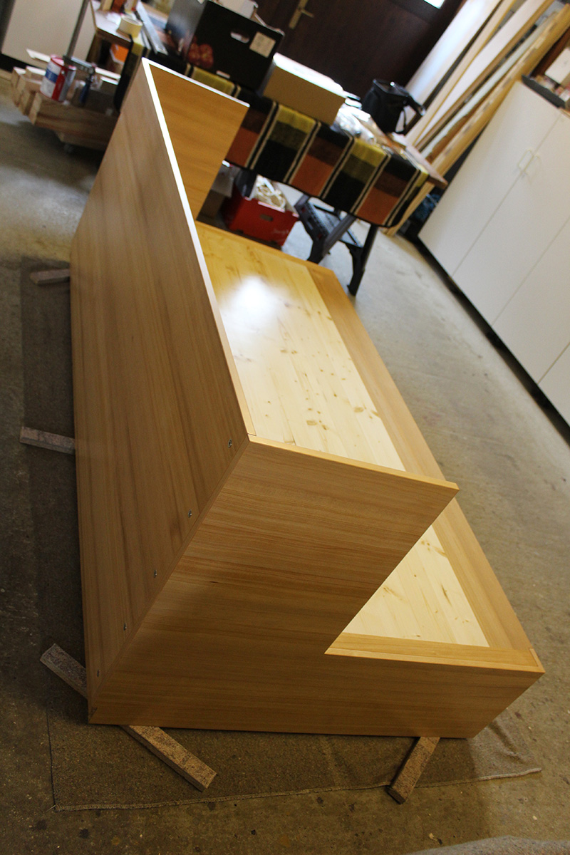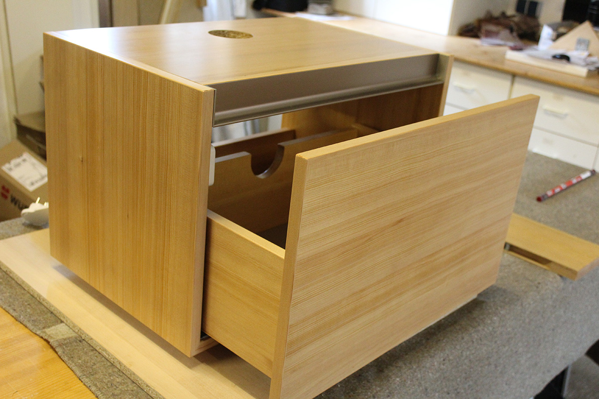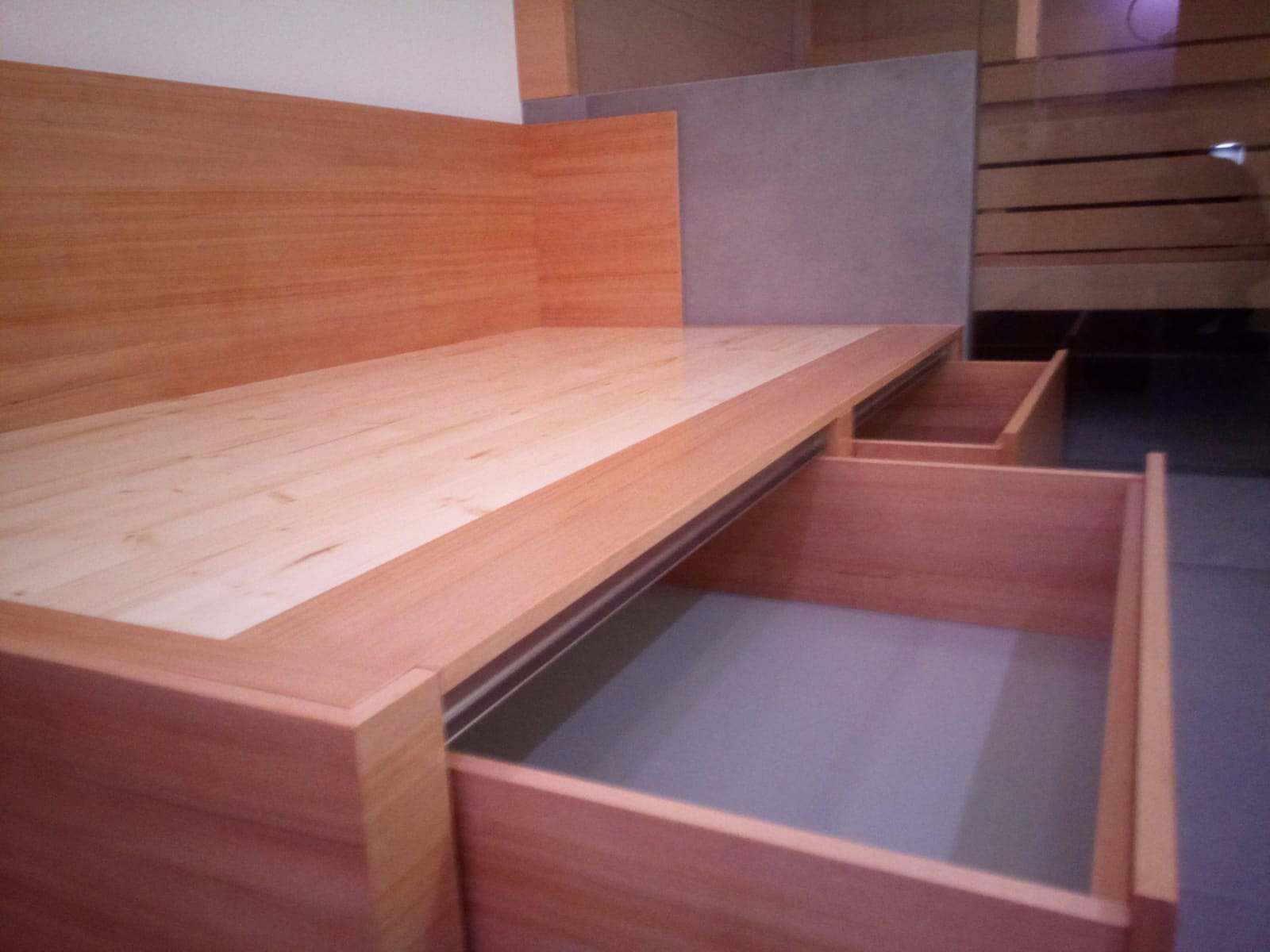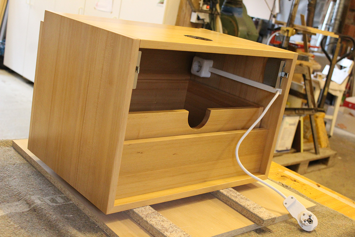 Diese Möbel entstanden für eine Wellnessbereich im Keller des Hauses. Sie vervollständigen Sauna, Wanne und Entspannungsraum. Genau wie in der Sauna sollte sich hier Holz als natürlicher Rohstoff wiederfinden.