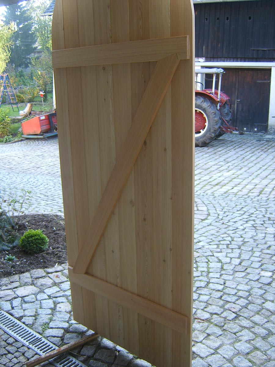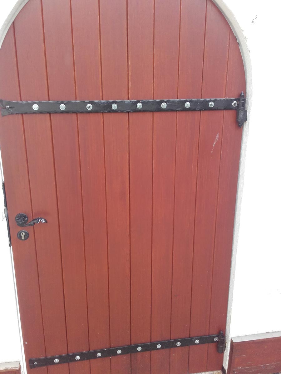 Diese Rundbogentür wirde komplett neu geschaffen. Schmiedeeiserne Beschläge und Bänder ergänzen sie.