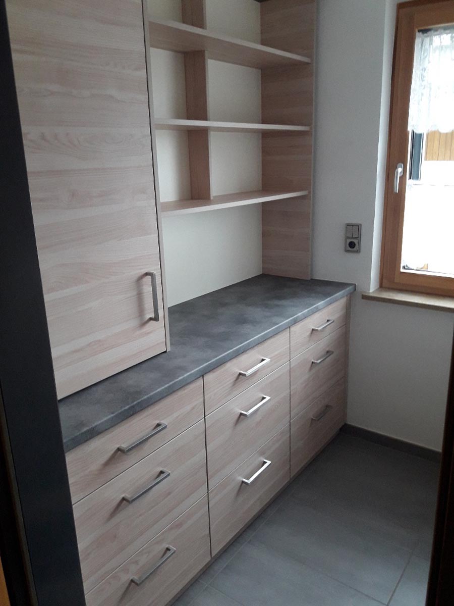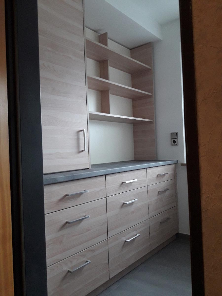 Eine Speisekammer muss nicht nur ein trostloser Ort mit Regalen sein. Diese wurde wurde mit einer modernen Kombination aus Schränken und Regelen bestückt. Hell und freundlich zeigt sie sich nun.