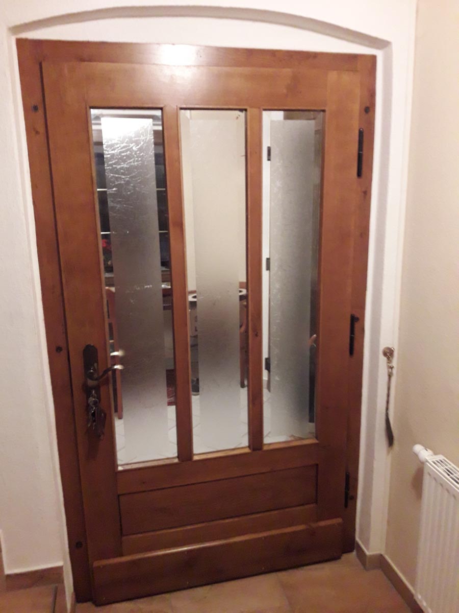 Diese Tür verlangte nach einer Überarbeitung. Die gesamte Oberfläche wurde überarbeitet. Zusätzlich wurden die Glaselemente getauscht, so das nun ein viel modernerter Eindruck entsteht. Im Vorher/Nachher Vergleich erkennt man es deutlich.