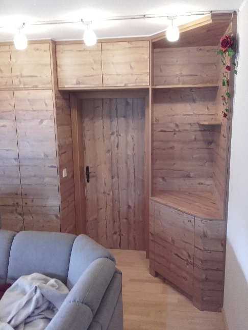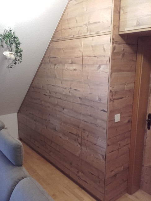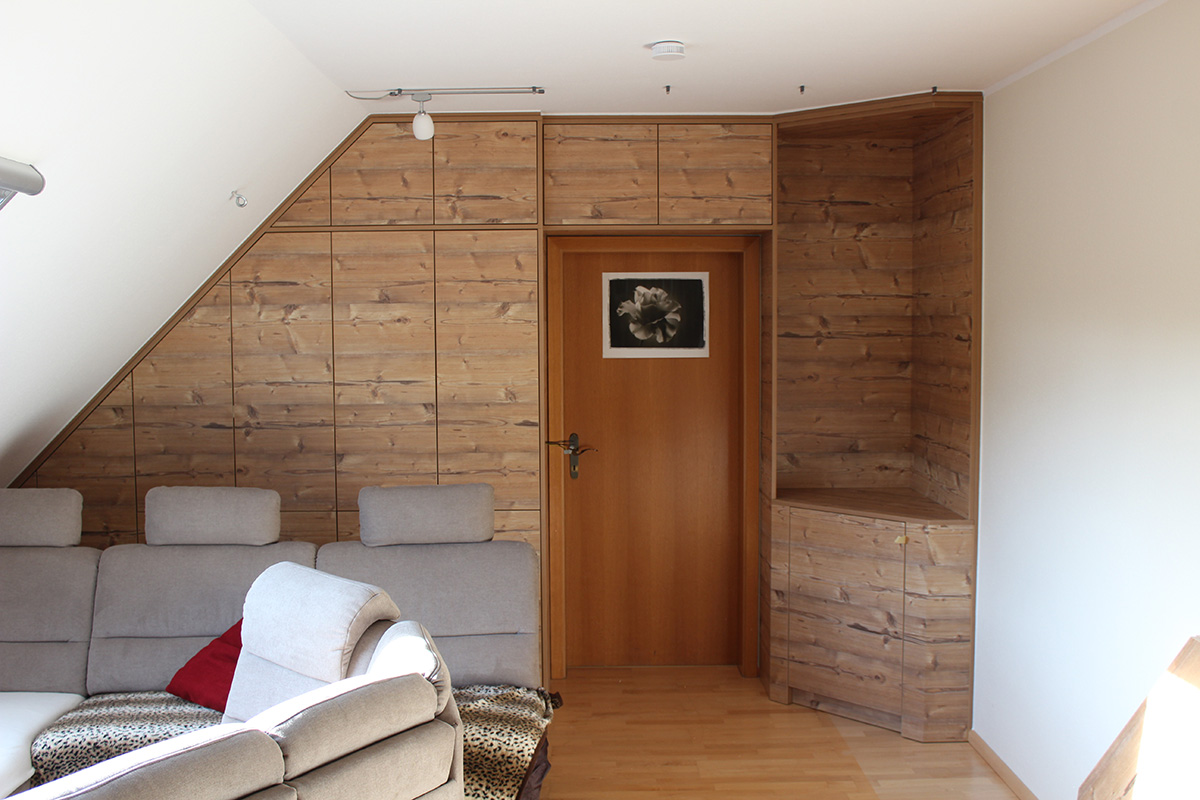 Diesmal wurde die komplette Wohnwand in einer Dachschräge verkleidet. Dabei sind sowohl die vorhandene Zimmertür integriert, als auch zusätzlicher Ablageplatz geschaffen worden. Das spezielle Muster der Oberfläche verändert die Optik des Raumes zum Positiven.