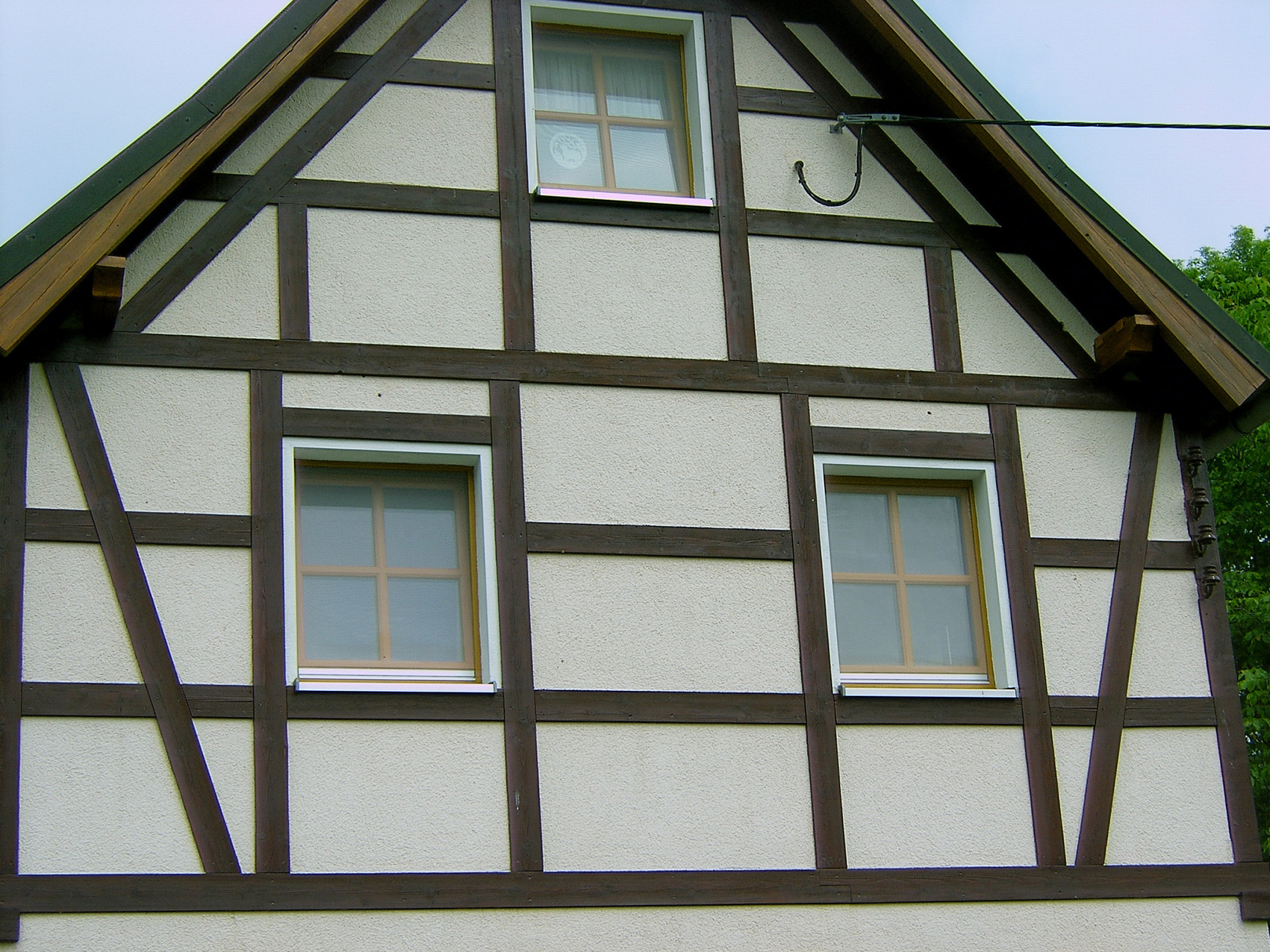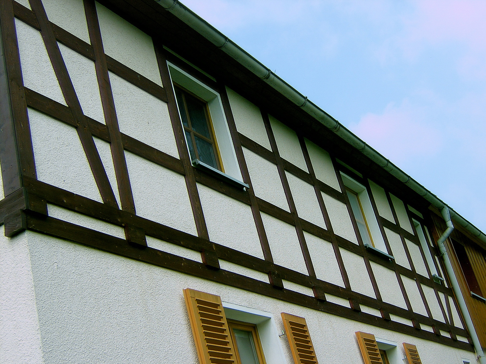 Aus neu mach alt. An der Fassade dieses Hauses wurde eine Fachwerk Imitation angebracht. Diese verleiht dem Haus einen ganz besonderen und historischen Charme.