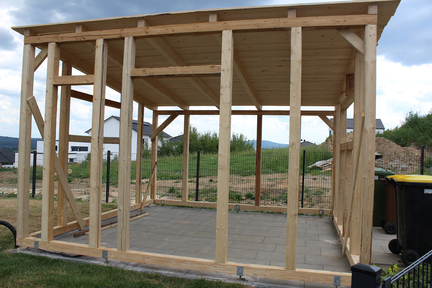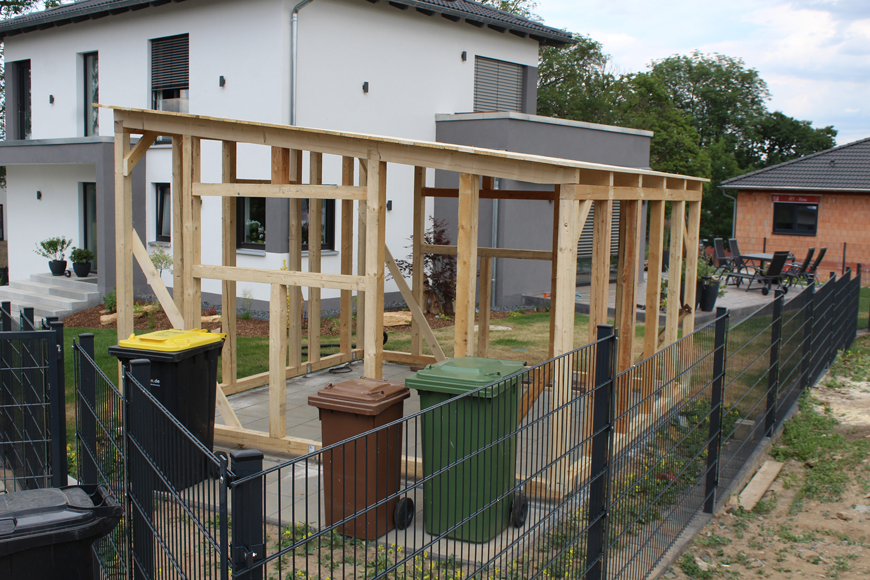 Neben dem modernen Steinhaus ergänzt dieses Gartenhaus das Anwesen mit einem natürlichen Rohstoff - Holz. Die Form lehnt sich dabei wieder an die Moderne des Hauptgebäudes an. Gleichzeitig dient es auch als "Tankstelle" für den Rasenroboter.
